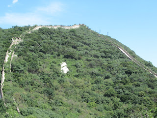 For my last full day in Beijing, I signed up for a hike that Kara found. It was with Beijing Hikers. It was a Jiankou to Mutianyu. It starts out on the wild wall, which is unrestored, and ends in the restored section in Mutianyu. It rises 1100m in a little under 2km to the general's tower and then by the ox horn and then down into Mutianyu. We met off a metro station on the northeast side of Beijing and headed north to a crossroads. The road to the start was narrow and twisty. It was barely wide enoug for our bus and an oncoming vehicle. When we got close we could see glimpses of the wall.